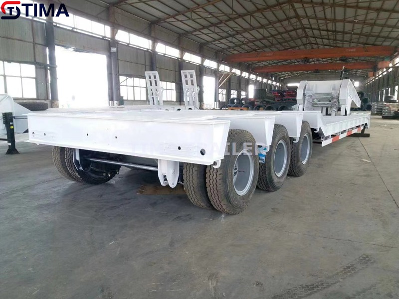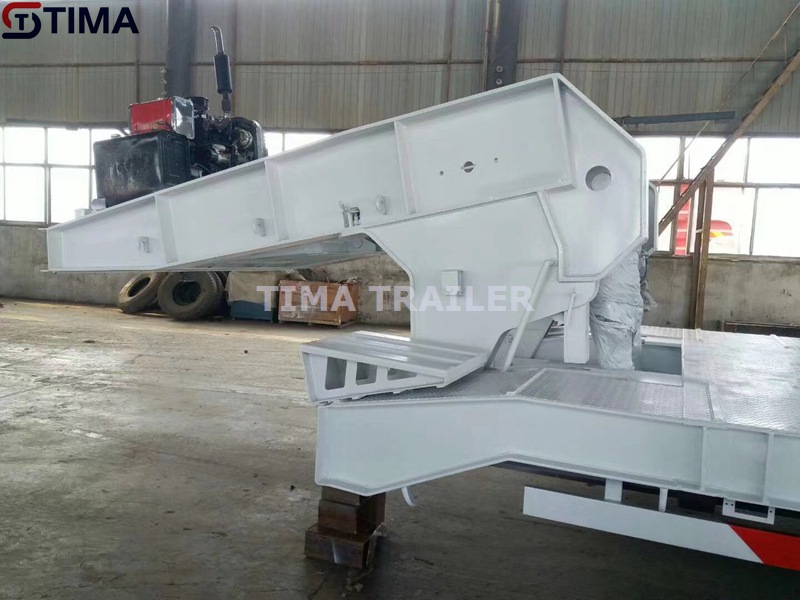 The low bed trailer is equipped with hydraulic suspension and axles to support heavy loads, and high-strength steel construction to ensure durability and maintain the trailer's shape. The deck is expandable, allowing for the transportation of larger equipment or machinery. The rear of the deck is designed to provide easy access to the cargo area, and loading ramps can be used to facilitate loading and unloading. Other safety features include cargo lock fixtures to secure the load, guardrails to prevent cargo from rubbing against the trailer, safety belts, and warning signs. The trailer can also be equipped with lighting and signaling systems for increased safety during nighttime and inclement weather conditions.